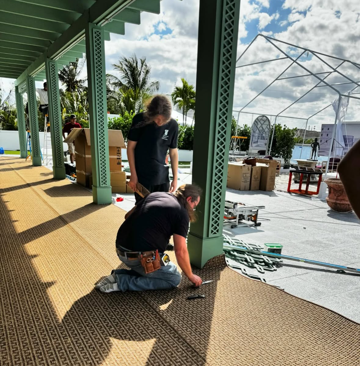 Wesley Lockwood & Ryan Lockwood installing the custom rooftop terrace rug at Kips Bay Palm Beach 2024